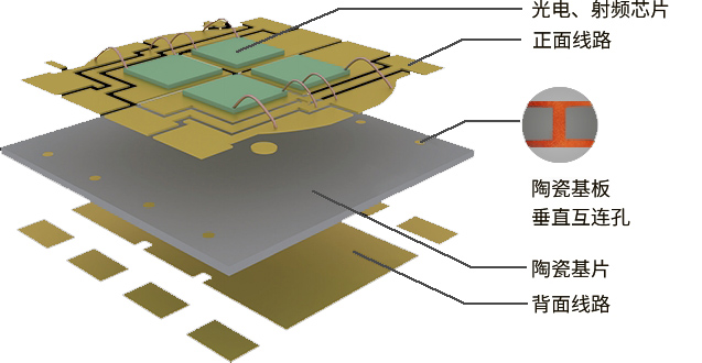 薄膜電路陶瓷封裝基板是一種通過磁控濺射薄膜金屬化與電鍍制程的技術:即根據應用需要,在高導熱的陶瓷基體上,采用薄膜金屬化及影像轉移方式制作2D金屬線路,然后采用TCV(Through Ceramic Via) 技術形成雙面布線間的垂直互連,最后采用堆疊技術獲得與陶瓷基體結合緊密的一體式3D金屬框架?;诒∧る娐饭に嚕ㄟ^磁控濺射實現陶瓷表面金屬化,通過電鍍實現銅層和金成的厚度大于10微米以上即DPC(DirectPlateCopper-直接鍍銅基板)。
